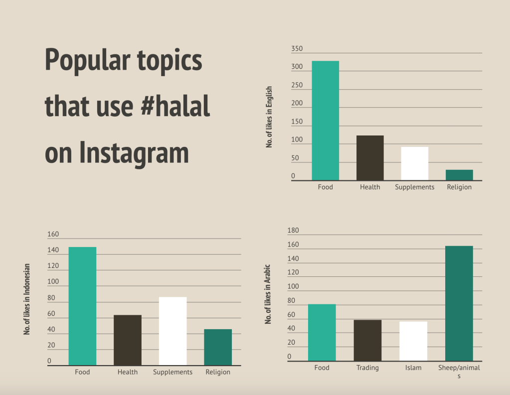 The study analyzed two Instagram datasets, using Halal in Arabic (325,665 posts) and in English (1,004,445 posts), which provide a global view of major Muslim populations around the world. A great variety is found in the use of halal within Arabic, English, and Indonesian-speaking populations. Animal trade makes up 61 percent of the language stream, food is second with 80 percent, and cosmetics and supplements are third with 70 percent.